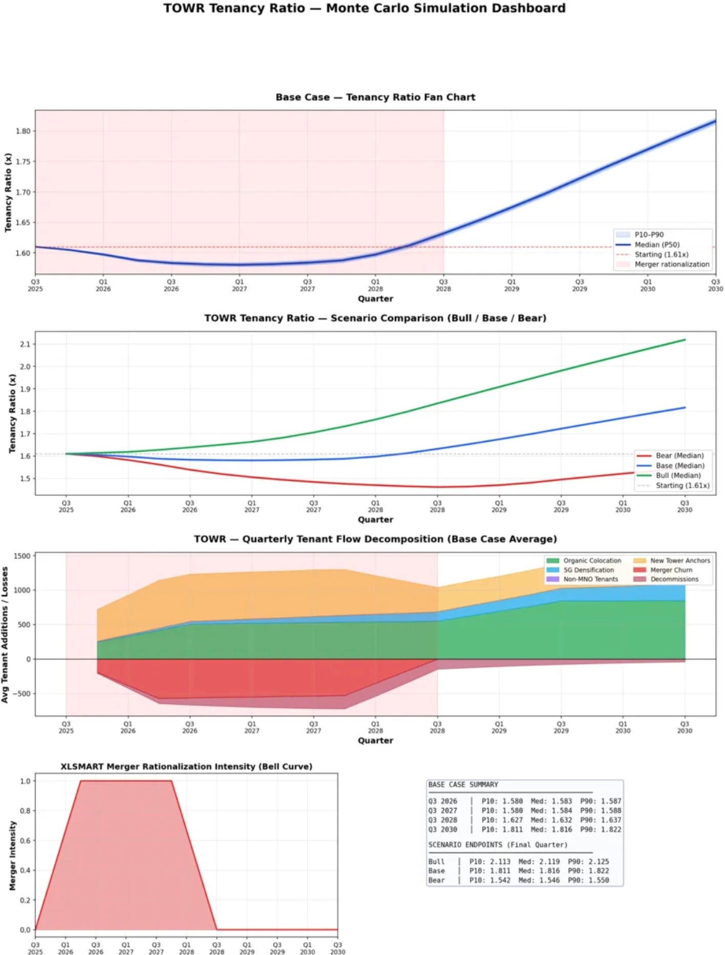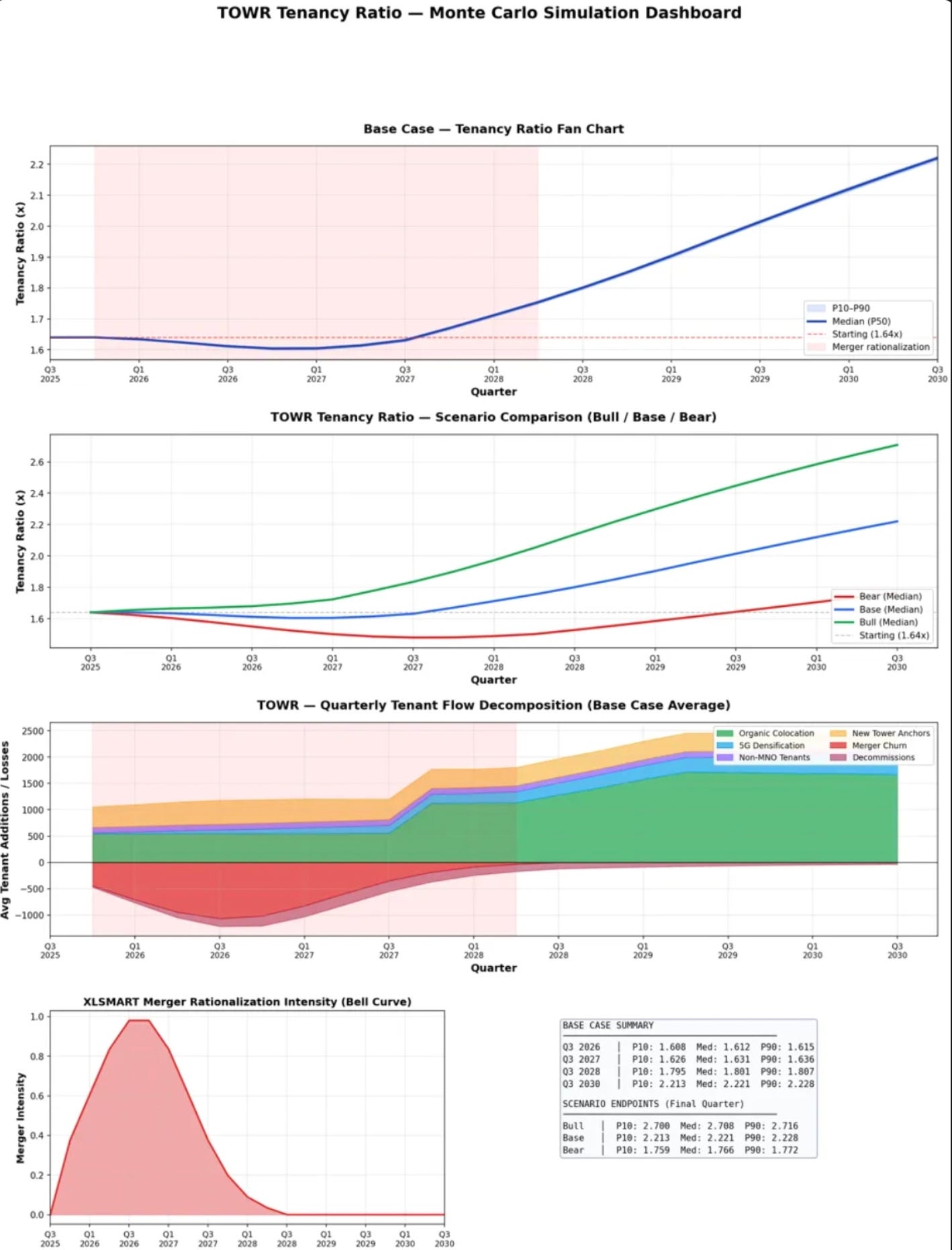 But the assumptions underneath the second picture have been far more closely scrutinised. I challenged every parameter and in many cases corrected them too. The organic colocation rate was halved. The swap ratio was cut by more than half. Non-MNO tenants were zeroed out. The merger intensity was redesigned entirely.