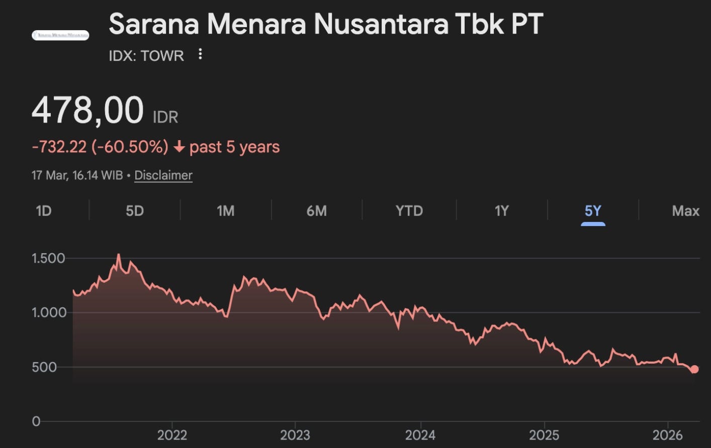 You could see below that the price of the share has seen a 60% drop in the last 5 years as this post was written. Markets might be harsh because TOWR might be seen as having an obsolete business especially because telco companies will have lesser need of those towers.
