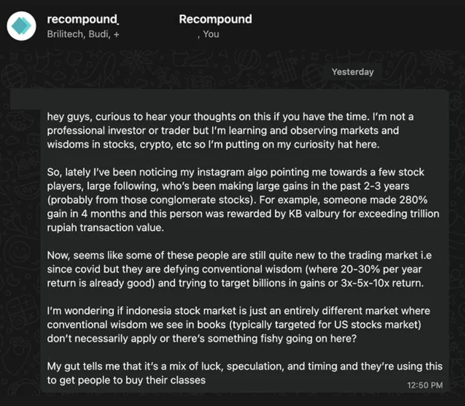 So, lately I’ve been noticing my instagram algo pointing me towards a few stock players, large following, who’s been making large gains in the past 2-3 years (probably from those conglomerate stocks). For example, someone made 280% gain in 4 months and this person was rewarded by KB valbury for exceeding trillion rupiah transaction value.