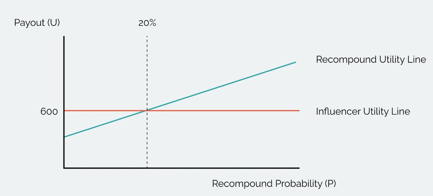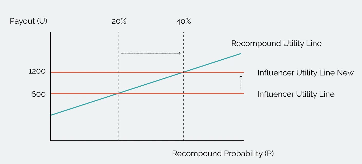 The next thing you know, the payout for influencers shift upwards and the probability for Recompound to be mathematically convincing enough for you needs to be doubled: