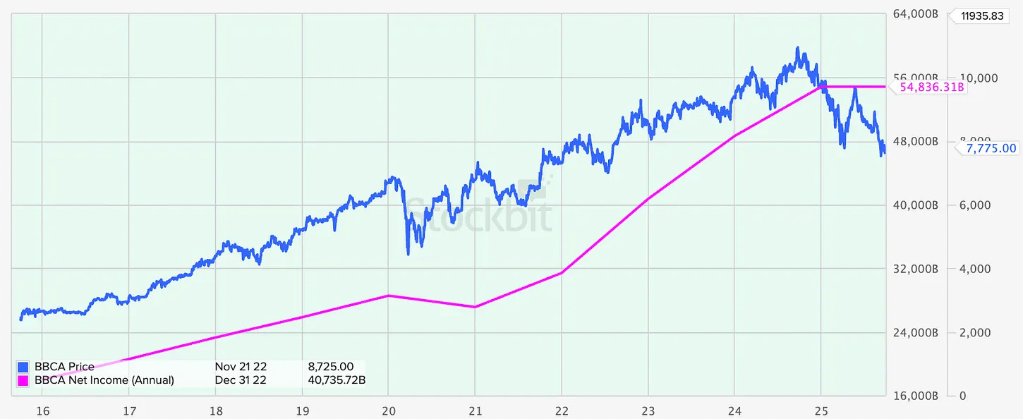 This is 10 year price vs earning chart of BBCA (biggest non SOE bank in Indonesia)