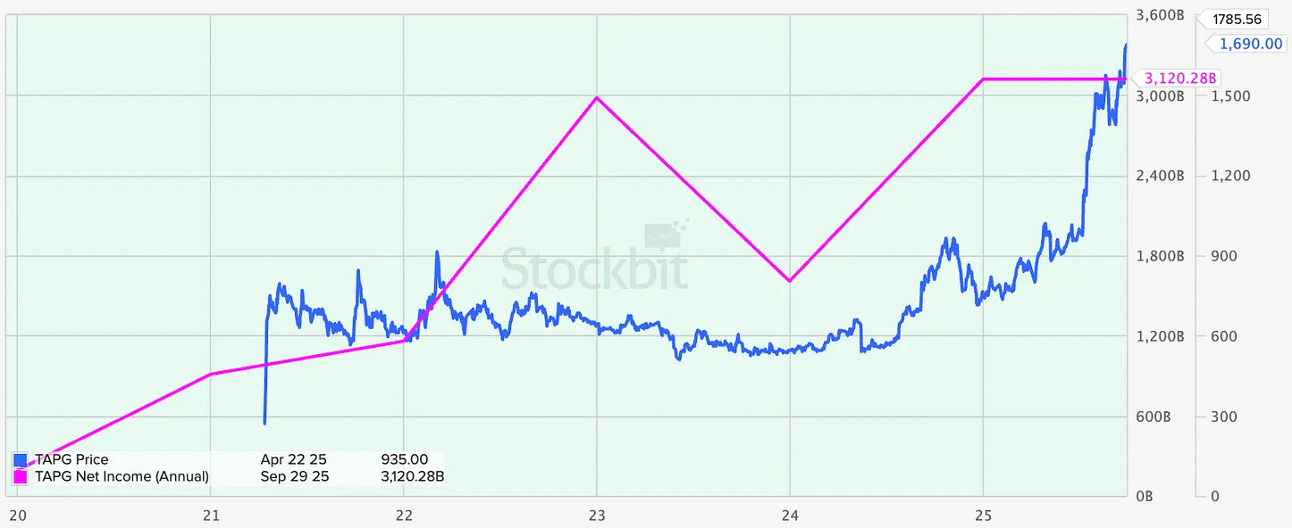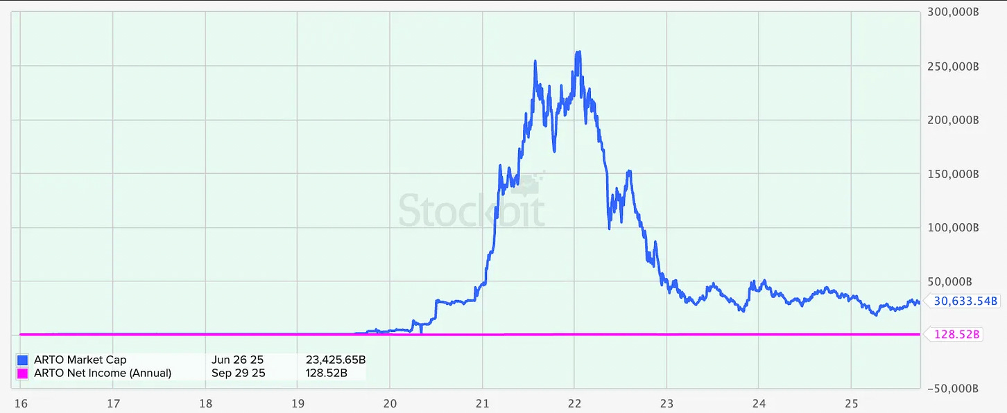 This one is ARTO (a digital bank in Indonesia). Its price was far beyond its fundamental value and it ended up reverting back.
