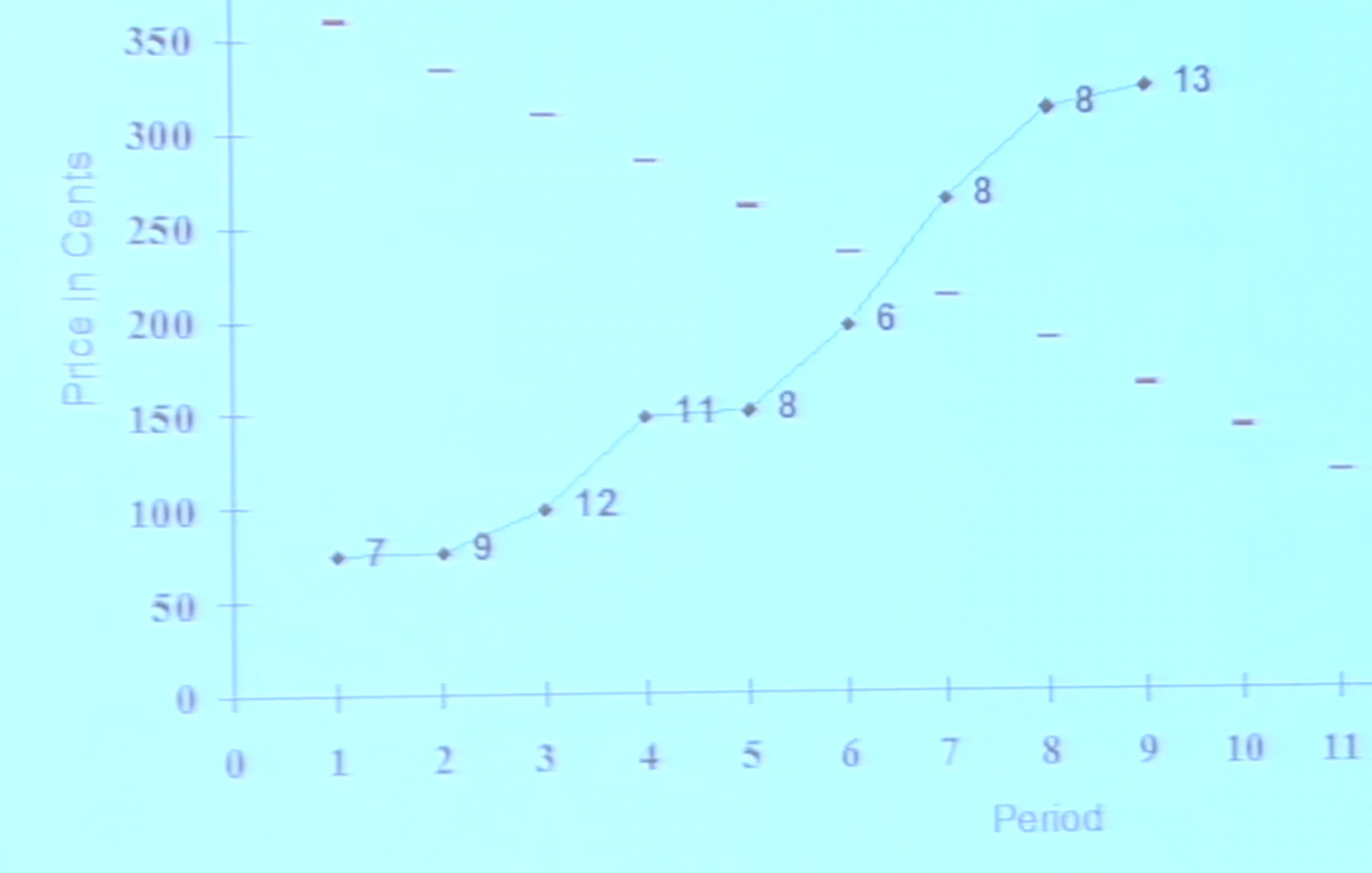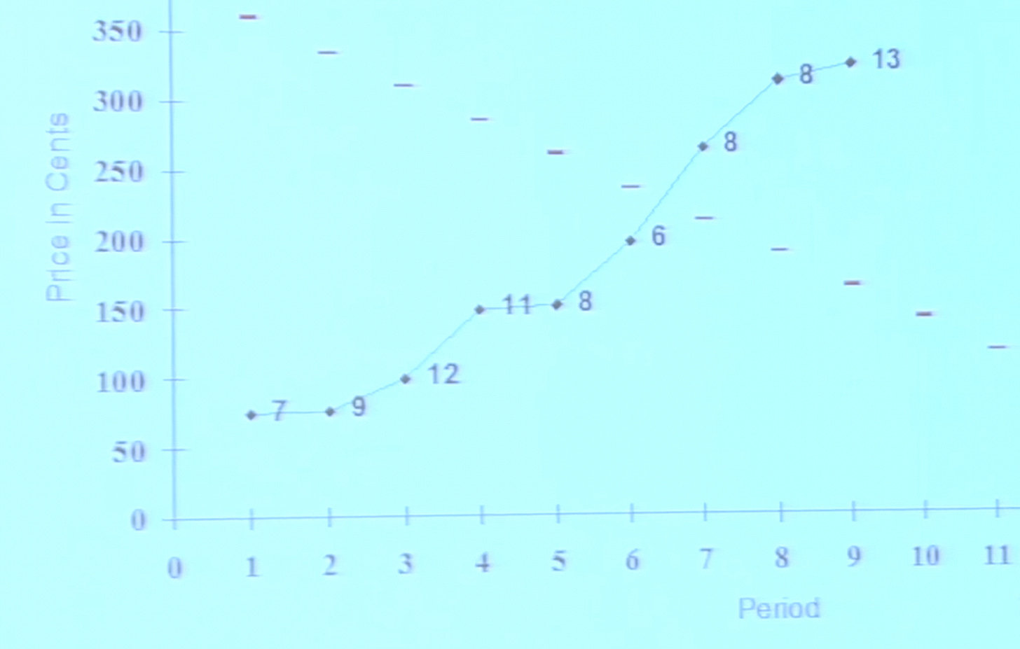 In the image above, you could see the flat line at each time period displaying the fundamental value of the asset. At the end of day 1 and 2. People are still generally timid. Only wanting to buy the asset far below its fundamental value (See price is only about $70 while the intrinsic value is at $300++). As more trading days have passed, we see that there is an increase of the asset price nearing its fundamental value as shown in the image below.