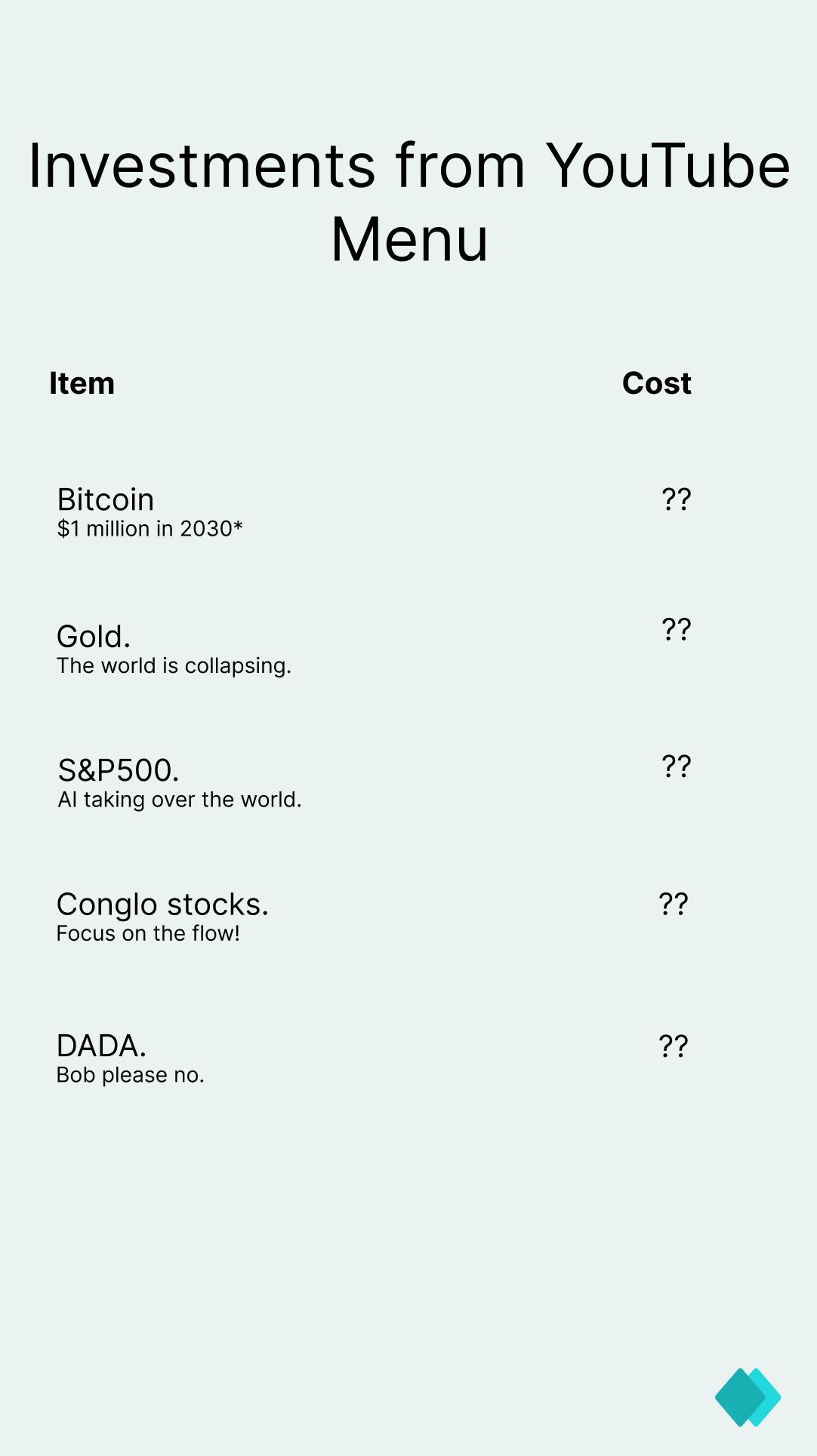 - stockpicking powered by the internet. Follow an investment discussion about a once in a life time opportunities → decide if that makes logical sense → if yes, buy!