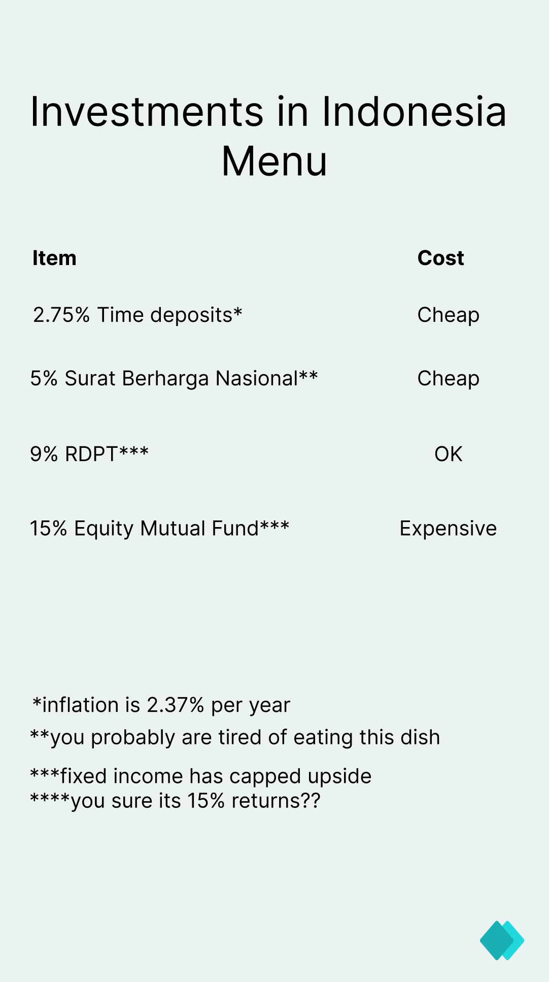 So as a Bob, it is like going to a restaurant called “Investments in Indonesia” and then being handed a menu like this: