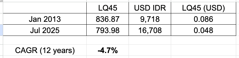 - Declining equity market for the past 12 years in USD terms (I believe LQ45 more, not IHSG)
