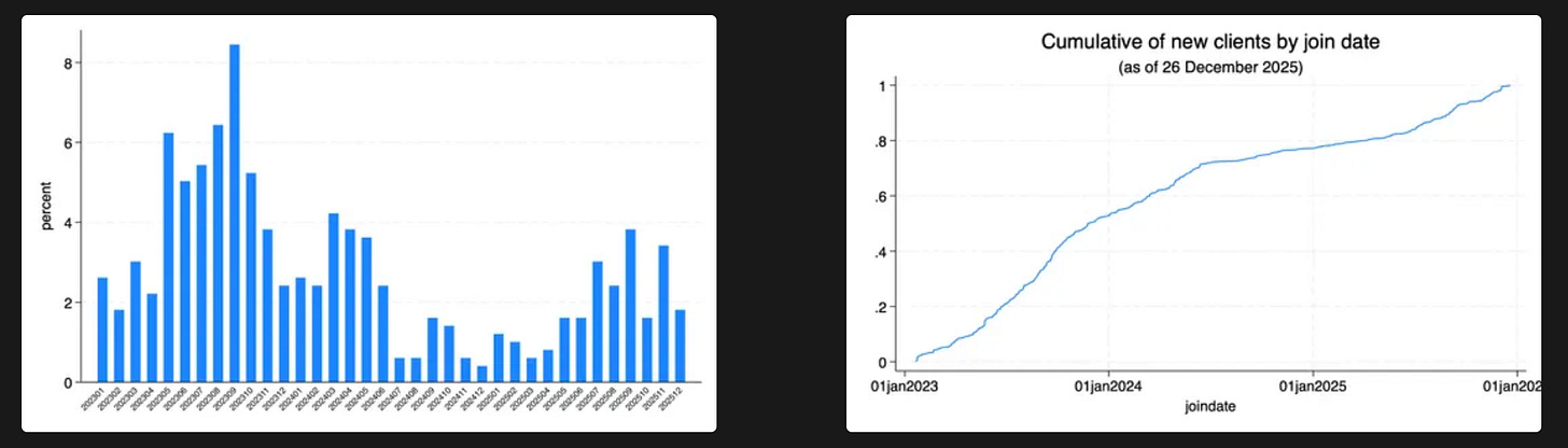 The number of new clients in 2025 was rather muted, especially in the first half of 2025. If you look at the chart on the right, we get 50% of our clients within the first year of our operations in 2023. In 2024, we acquire about 30% of all our existing clients. In 2025, we only acquired 20%.