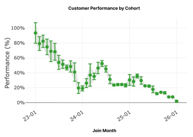 Furthermore, the chart above tells us a really important information. It manages expectation of our prospect customers because it most likely would be sucky if a customer only has been active for a month. But on the flip side, the longer the customer wait, by and large would give larger and larger returns. Again, we are self-interested: we want our customers to recompound their wealth so that we can recompound our profits (very much pun intended).