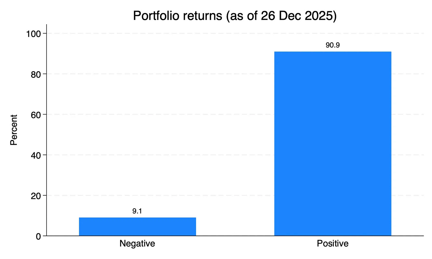 Since our inception in January 2023 until December 2025, 91% of our clients’ portfolio are in the green, while 9% are still in the red.