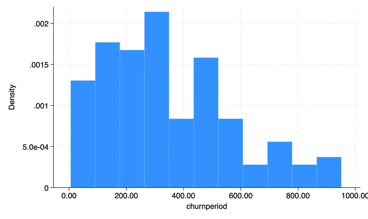 Among those who churned, the median length they stay with us is 319 days or about 10 months. The average length is 351 days or close to 12 months.
