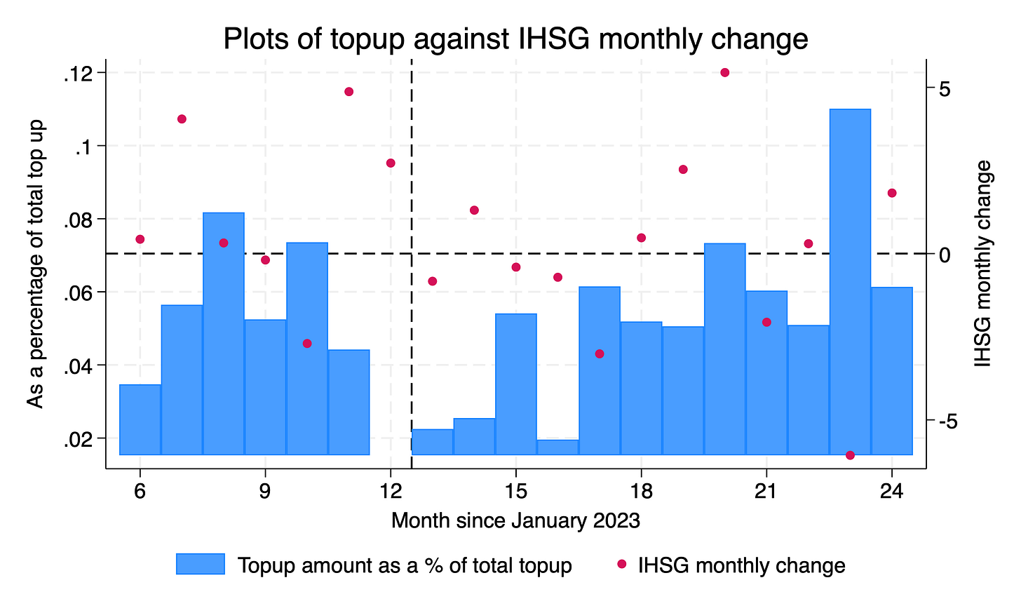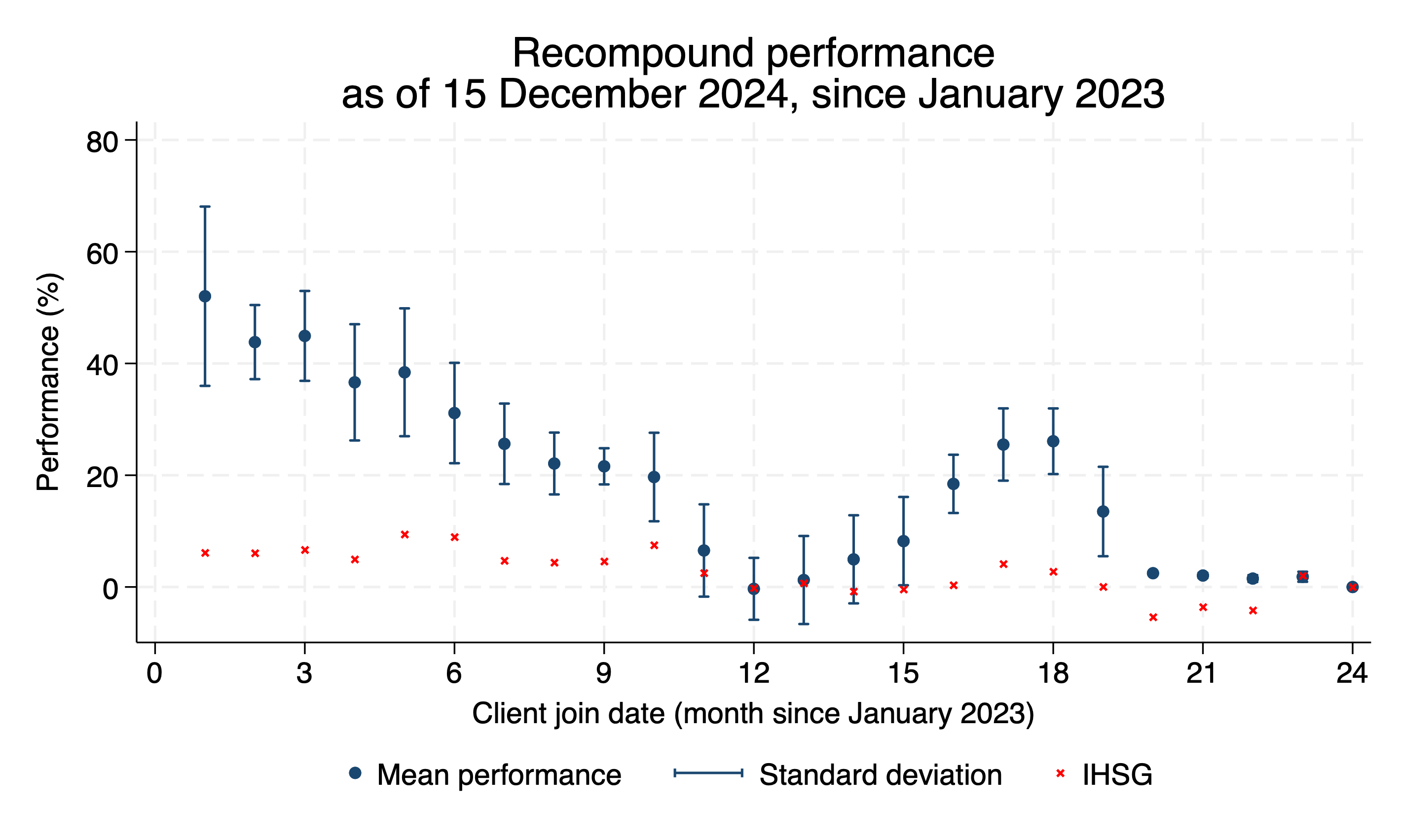Given the fact that our clients join us at different times, we compare the outcomes for each batch of client should they invest through Recompound versus if they invest wholly in IHSG. Taking an example of clients who join us in January 2023 (those who join us in month 1):