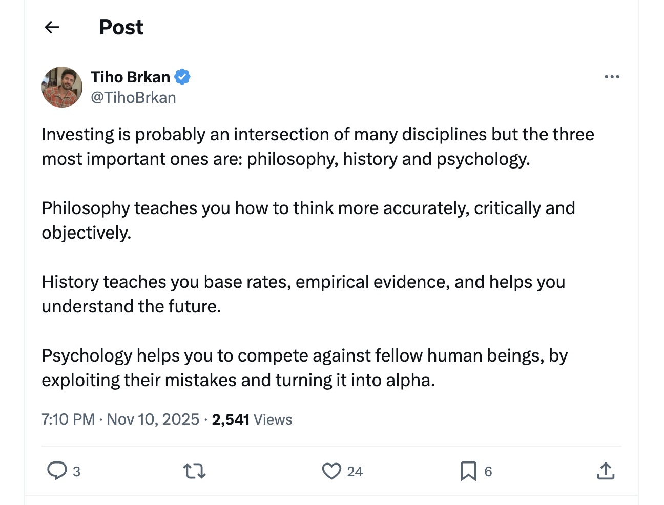 As one investor Tiho Brkan noted, successful long term investing is the intersection of three disciplines: Philosophy, History, and Psychology.