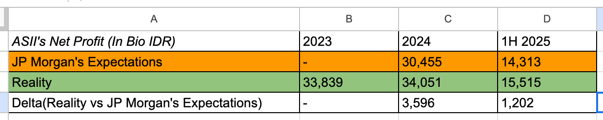 Below you can see how ASII’s actual net profit cleared J.P. Morgan’s Feb-24 downgrade bar—by about Rp3.6T (+11.8%) in 2024 and Rp1.2T (+8.4%) in 1H25. That “better than feared” gap is what fueled the rerating.