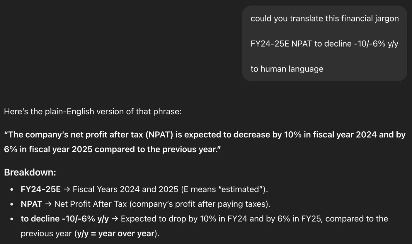 You could clearly see that the author is deeply pessimistic about ASII’s business performance from the released research report. Because of his mall visit and people’s reactions towards the new line of cars. It was said: Astra’s FY24-25E NPAT to decline -10/-6% y/y. What does it mean even? So I chatgpt-ed it.