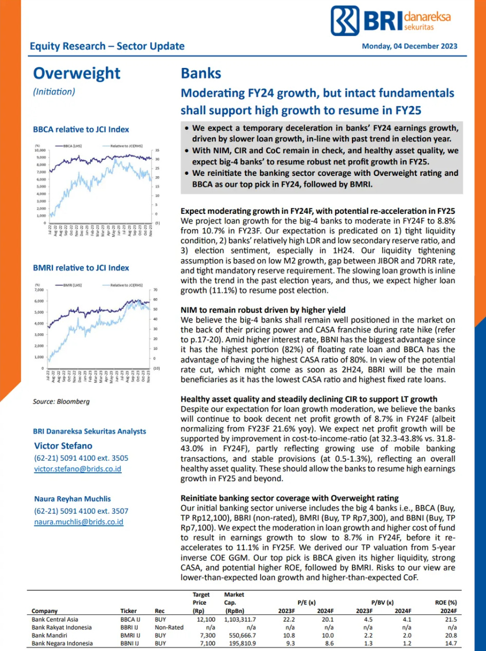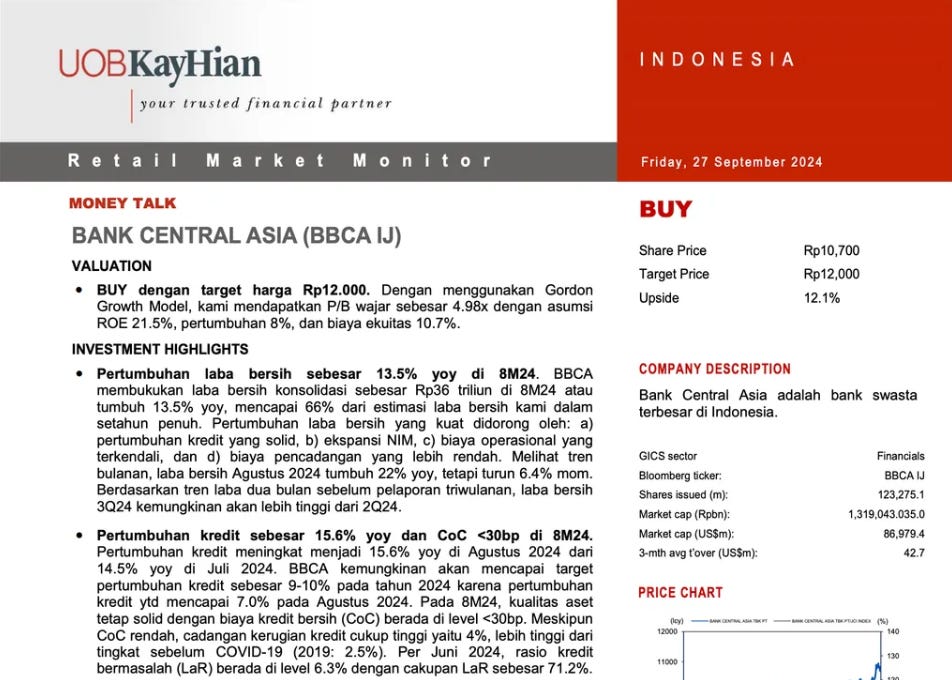 Back in Dec 2023, BRI Danareksa restarted coverage on BBCA with a BUY and a target price of Rp12,100, using a valuation anchored on the bank’s returns and a low “required return” (their term for the return investors demand).
