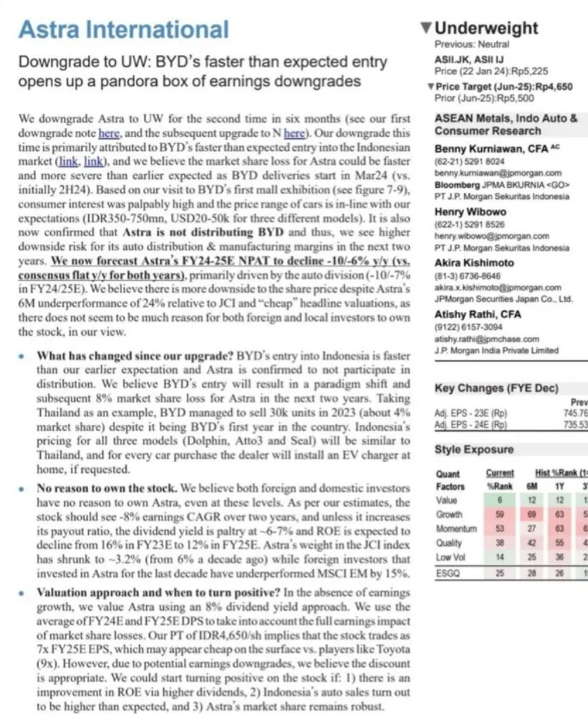 Quoting the folks in the research report below: We downgrade Astra to UW for the second time in six months. Our downgrade this time is primarily attributed to BYD’s faster than expected entry into the Indonesian market, and we believe the market share loss for Astra could be faster and more severe than earlier expected as BYD delivers start in Mar24 (vs. initially 2H24). Based on our visit to BYD’s first mall exhibition, consumer interest was palpably high and the price range of cars is in-line with our expectations. It is also now confirmed that Astra is not distributing BYD and thus, we see higher downside risk for its auto distribution & manifacturing margins in the next two years. We now forecast Astra’s FY24-25E NPAT to decline -10/-6% y/y (vs. consensus flat y/y for both years).